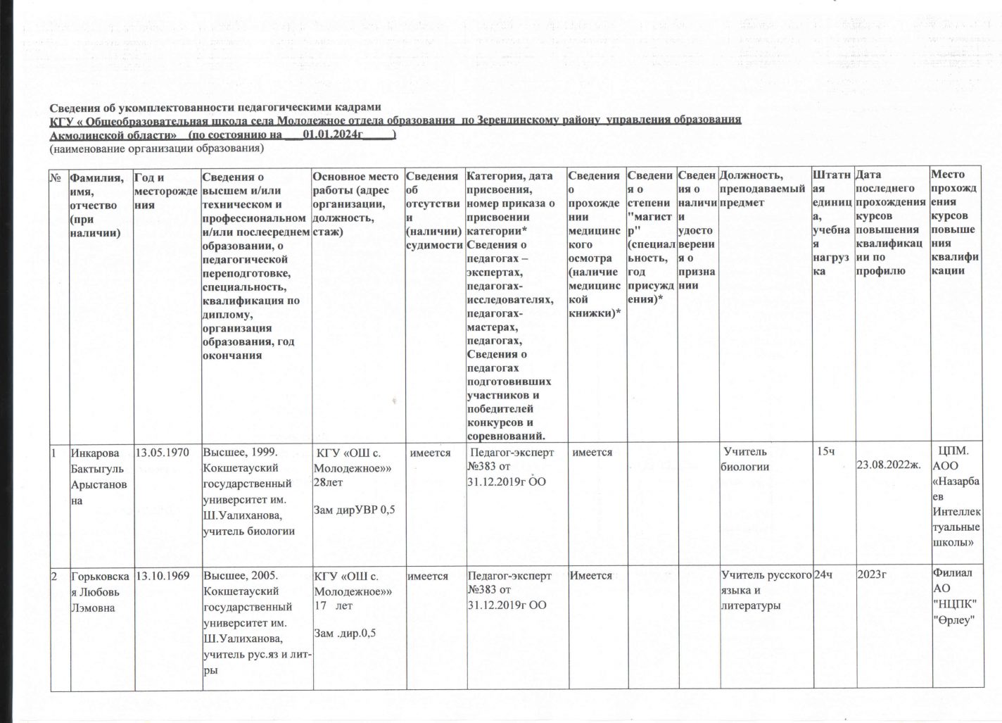 Сведения об укомплектованности педагогическими кадрами
