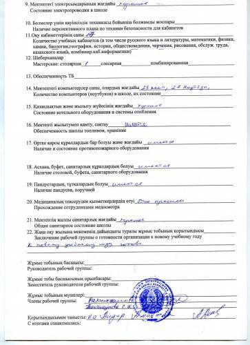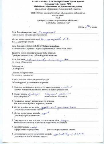 Білім беру ұйымының 2022-2023 оқу жылына дайындығын тексеру актісі.