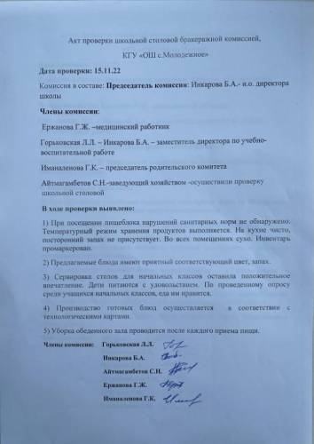 Бракераждық комиссияның мектеп асханасын тексеру актісі. 15.11.22