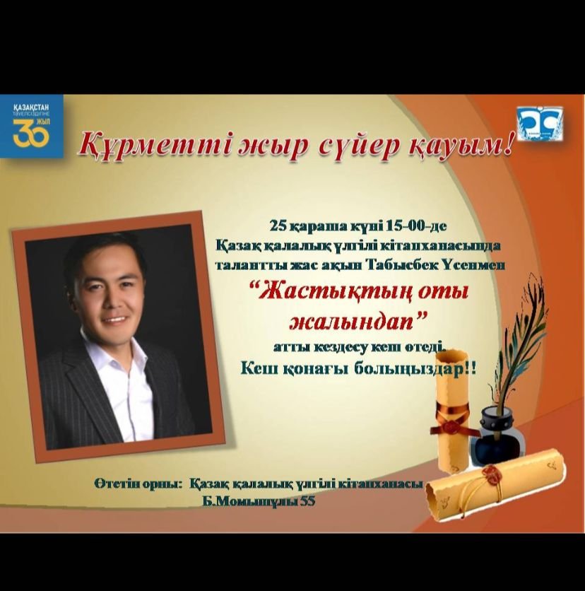 25-қараша күні Қазақ қалалық үлгілі кітапханасында талантты жас ақын, мектебіміздің қазақ тілі мен әдебиеті пәні мұғалімі Үсен Табысбектің "Жастықтың оты жалындап" атты кездесу кеші өтті. Кешке мектеп оқушылары мен ақындар қатысты. Мектебіміздің оқушылары да кеш...