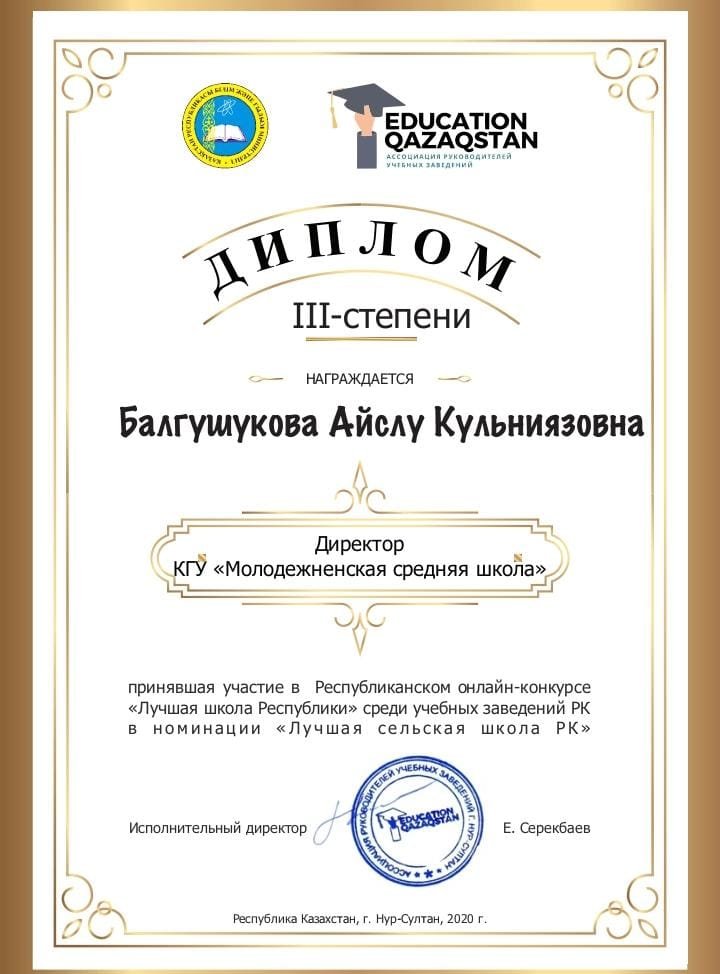 Молодежный орта мектебі Қазақстан Республикасының білім беру мекемелері арасындағы «Республиканың үздік мектебі» Республикалық онлайн байқауына қатысып, «Үздік ауыл мектебі» номинациясы бойынша 3 дәрежелі дипломмен марапатталды.