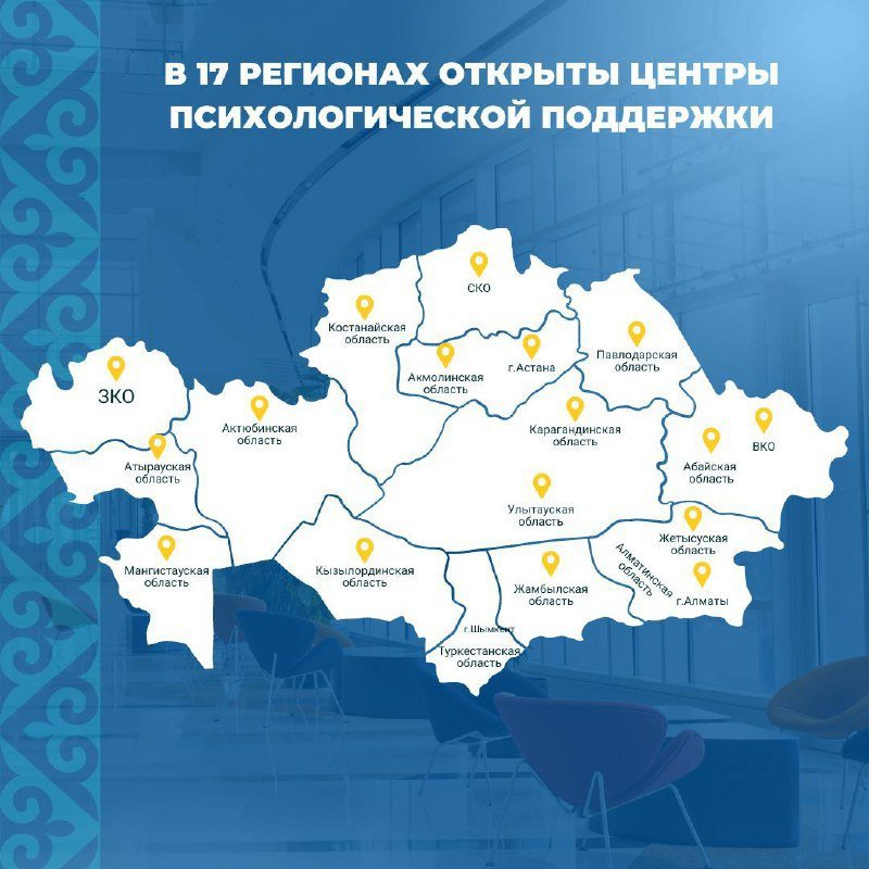 Мемлекет басшысының тапсырмасына сәйкес еліміздің әр өңірінде психологиялық қолдау орталығын ашу жұмыстары жүргізілуде. Бүгінгі таңда мұндай орталықтар 17 өңірде ашылды.