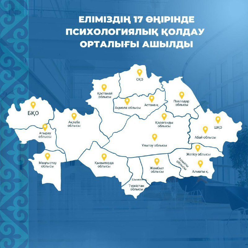 Мемлекет басшысының тапсырмасына сәйкес еліміздің әр өңірінде психологиялық қолдау орталығын ашу жұмыстары жүргізілуде. Бүгінгі таңда мұндай орталықтар 17 өңірде ашылды.